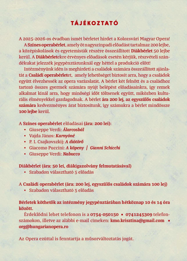 A Színes operabérlet, amely öt nagyszínpadi előadást tartalmaz 200 lejbe, a középiskolások és egyetemisták részére összeállított Diákbérlet 50 lejbe kerül. A Diákbérletekre érvényes előadások esetén kérjük, részvételi szándékukat jelezzék jegypénztárunknál egy héttel a produkció előtt!